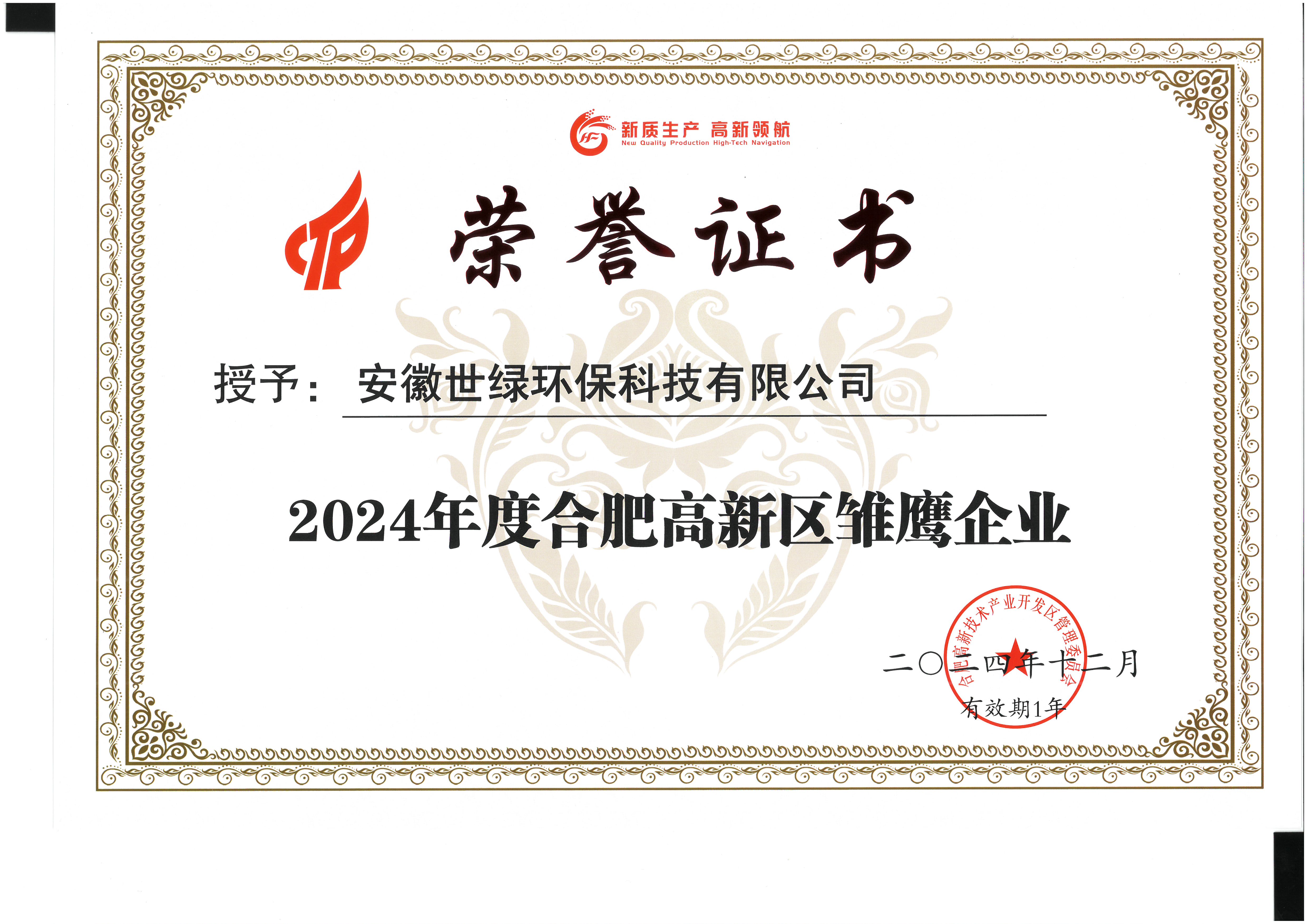 2024年的尾聲,安徽世綠環(huán)保科技有限公司憑借其卓越的創(chuàng)新能力和在環(huán)保領(lǐng)域的杰出貢獻(xiàn),榮獲了“2024年合肥高新區(qū)新質(zhì)生產(chǎn)力企業(yè)”的稱(chēng)號(hào)。這一榮譽(yù)不僅是對(duì)世綠環(huán)保科技長(zhǎng)期以來(lái)努力的肯定,更是對(duì)其在推動(dòng)環(huán)保產(chǎn)業(yè)發(fā)展、促進(jìn)生態(tài)文明建設(shè)方面所做貢獻(xiàn)的高度認(rèn)可。